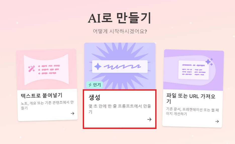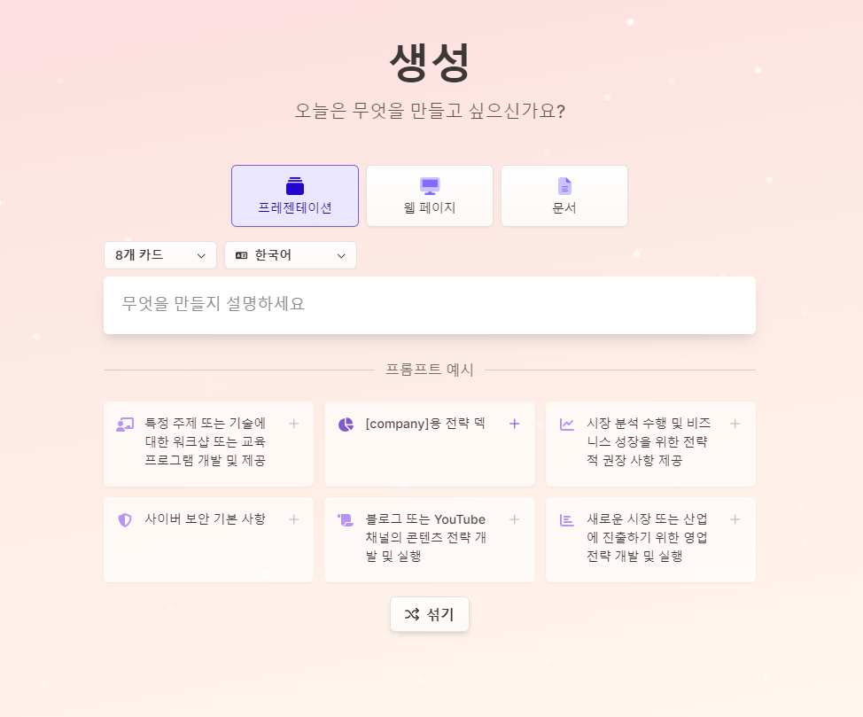 - 텍스트 양, 이미지 스타일, 프레젠테이션 톤 등을 설정 가능