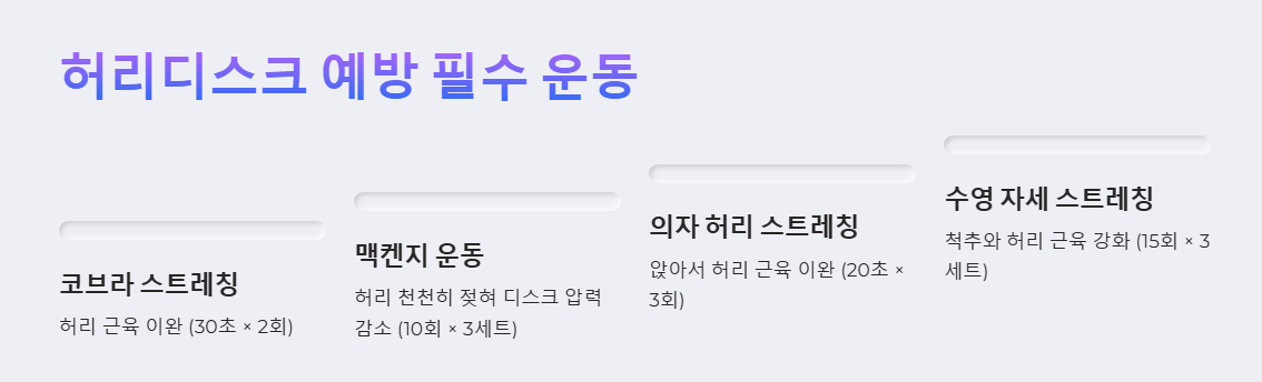 - 맥켄지 운동 : 허리를 천천히 젖혀 디스크 압력 감소 (10회 × 3세트)